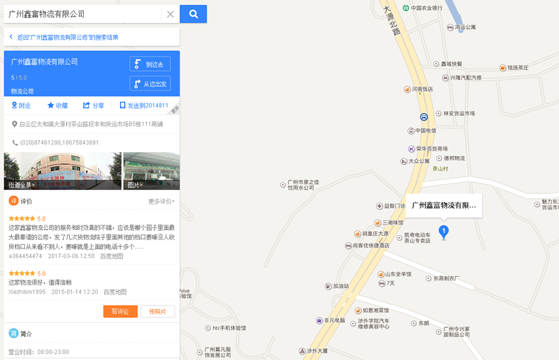 很多客戶在發(fā)貨的時候在沒有去過的地方都會采用百度地圖,多次客戶在通過經(jīng)驗識別路況的時候到了鑫富物流公司附近都找不到公司的具體地址,那么好了,今天小鑫就為你提供廣州鑫富物流有限公司的百度地圖,這樣的話你就不用擔(dān)心再迷路或者找不到路了,點擊圖片就可以進(jìn)入地圖了: