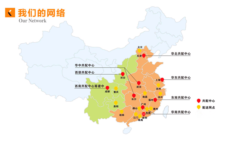 目前,公司在全國主要城市建立了多個大型共配中心,管理的倉庫面積約40萬平方米,業(yè)務區(qū)域涵蓋:華南、華東、華中、華北、西南地區(qū),配送服務網(wǎng)絡包括電商、KA、BC、批發(fā)、餐飲、特通等。